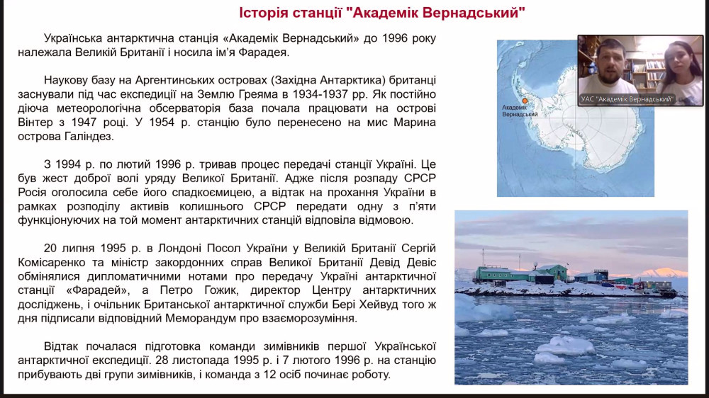 Учні Одеського ліцею №56 мали можливість взяти участь у онлайн-зустрічі з науковцями української антарктичної станції «Академік Вернадський». Ця подія стала чудовою нагодою для дітей дізнатися більше про науку та життя на крижаному континенті. Як повідомляє Одеський 56 ліцей, школярі мали можливість приєднатися до Zoom-зустрічі з учасниками 30-ї Української антарктичної експедиції. Біологиня Єлизавета Сафонова, яка є уродженкою Одеси, та її колега Тарас Перетятко розповіли про цікаві факти флори та фауни Аргентинських островів, а також про наукові дослідження, що проводяться в Антарктиді, звертаючи увагу на важливість проблеми зміни клімату для цього регіону.